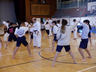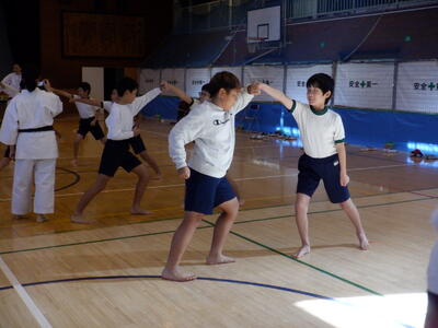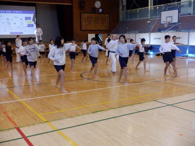 日野市空手連盟の方をお呼びし、空手についてのお話を聞いたり、体育館で実際に空手の型を体験したりしました。