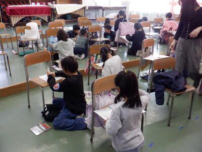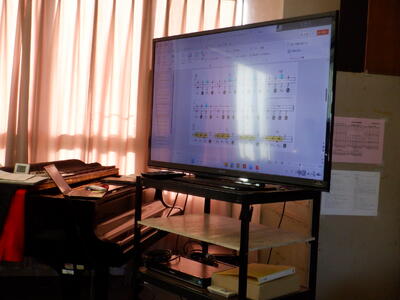 音楽室に行くと、何やら、譜面に色を塗っています。