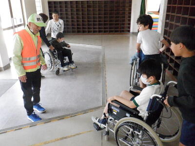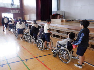 今日、6年生は、社会福祉協議会の方々のご指導で、車椅子体験を行いました。