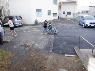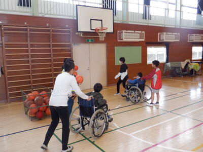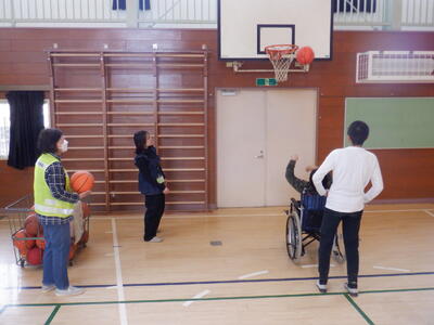 車椅子に乗り、狭いところを通ったり、段差のあることろを通ったり、ボールをバスケットゴールに入れたりしました。
