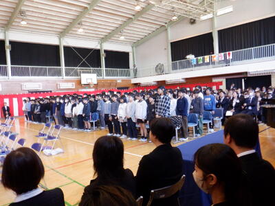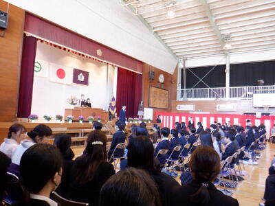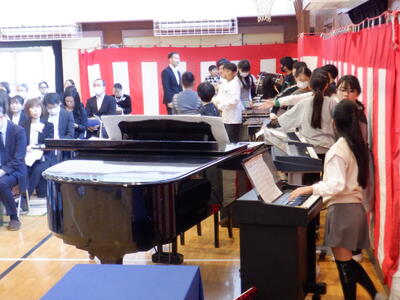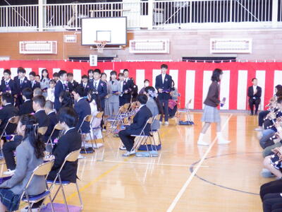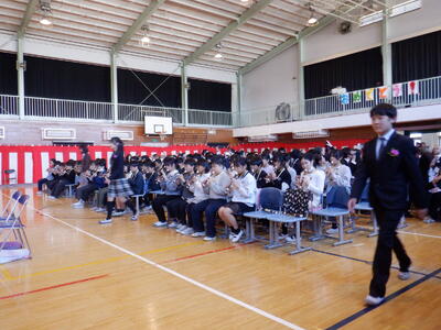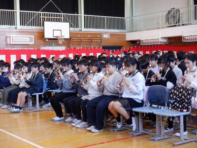 6年生の入場が始まりました。音楽は5年生のリコーダーと合奏です。