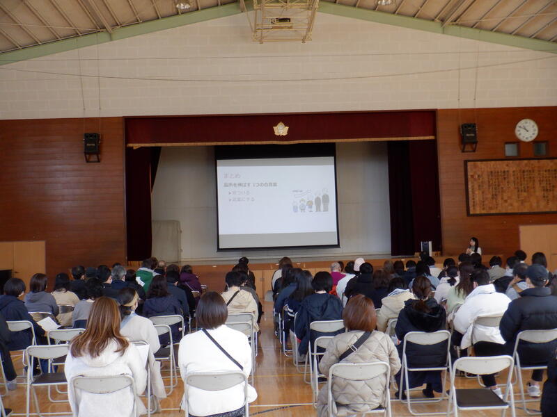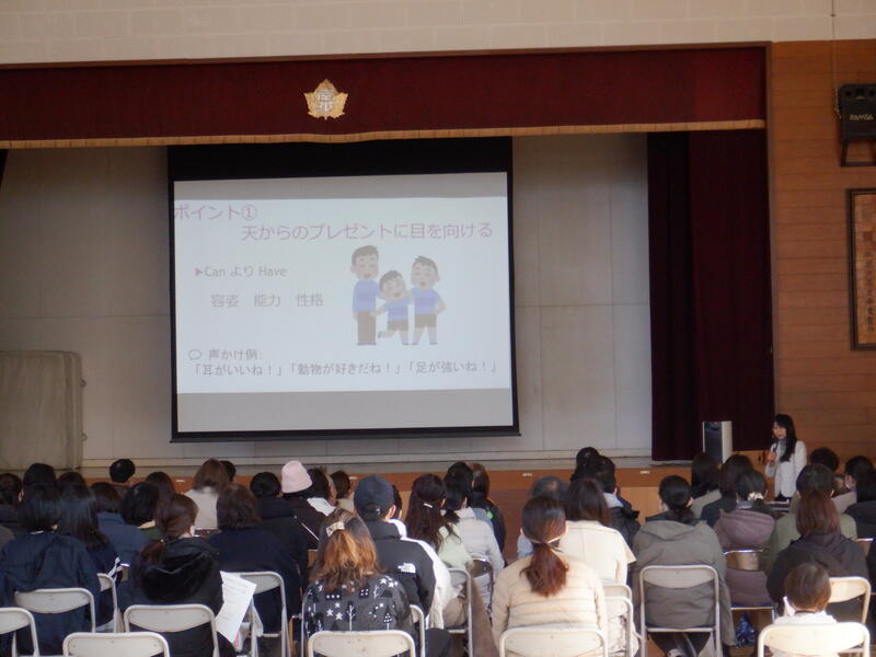 土曜日には「子どもの長所をグングンのばす子育て」をテーマとした講演会が、3時間目に体育館で行われました。