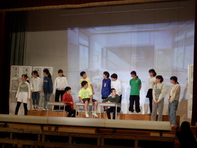 集会の委員会発表では、各委員会が、委員会の活動紹介や、全校へ伝いたいことを発信しています。