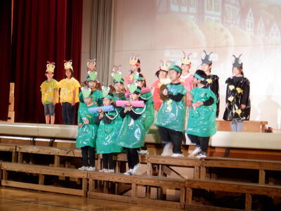2年生は、劇「ムーシ村の音楽会」。今日は劇に出てくる歌の練習をしていました、