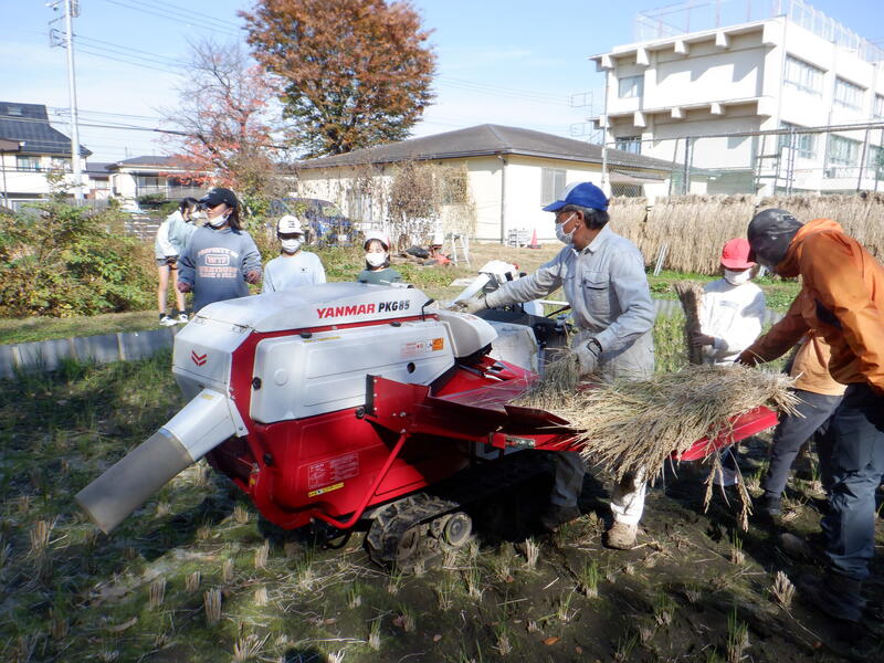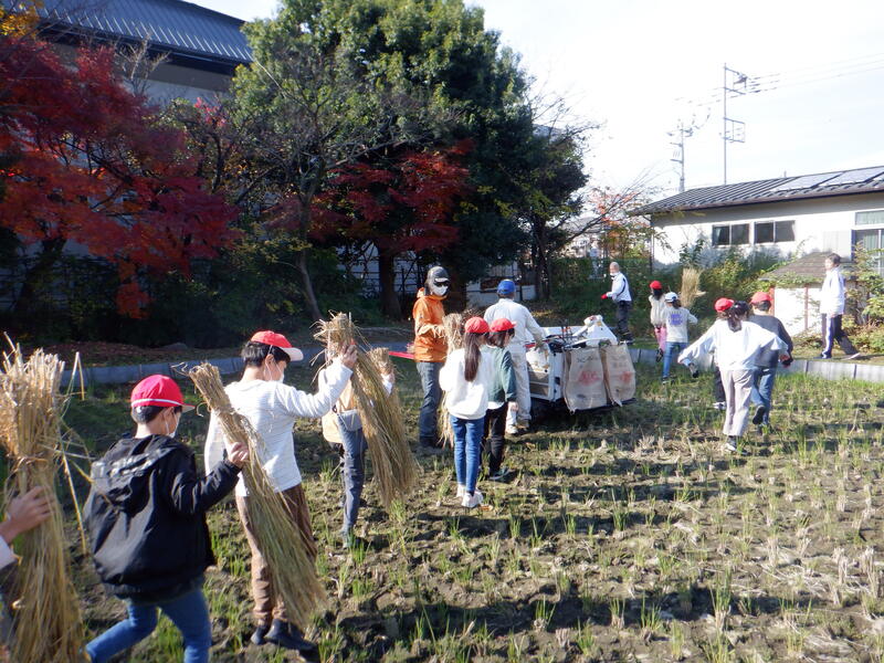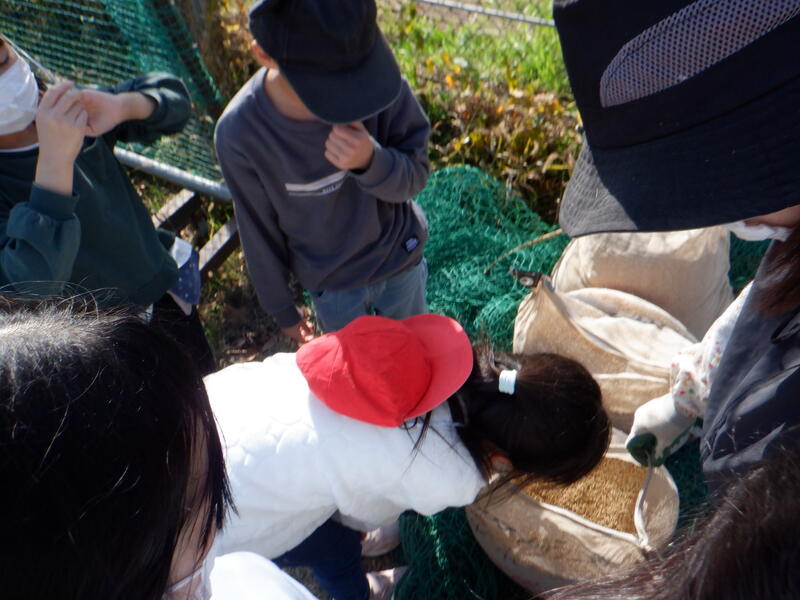 先月行った稲刈りの稲は天日干しにしていましたが、先週の水曜日に、4年生の学習でそれを脱穀しました。