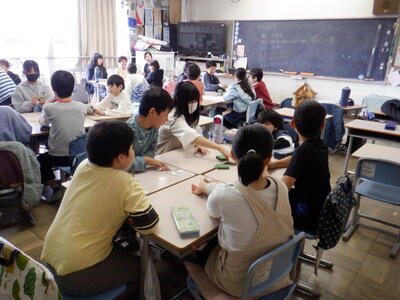 講師の加藤先生が、その伝統工芸品の実物をもっているということで、4年生の児童のためにもってきてくださり、触ったり、着たりなどの体験をさせてくださっているところです。
