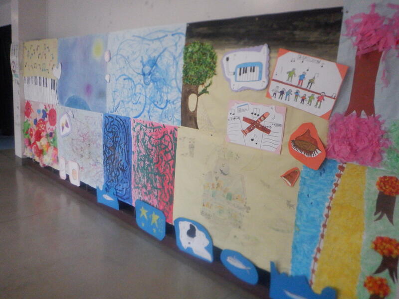 これは、2年生の学芸会「ムーシ村の音楽会」の衣装として身に付ける「お面」の材料を、廊下に並べておいたものです。