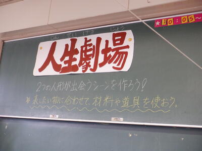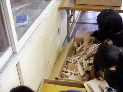 図工では、「人生劇場」というタイトルで、小さな人の模型の姿をもとに、それを取り巻く世界を立体で作り上げていきます。まだ、始まったばかりの授業ですが、座っている人の模型のために、木工作の端切れからベンチを作ったり、その周囲に生えている木を作ったりし始めていました。これからどのような世界が出来上がるのかが楽しみです。