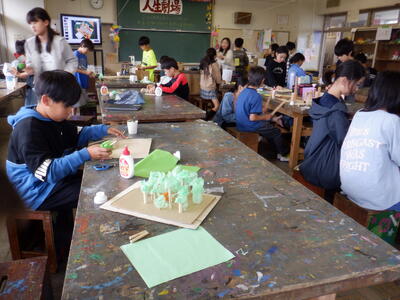 3年生は「パワーアップキノコ」が出来上がってきました。終わった子はトロフィーづくりです。紙コップに紙粘土を貼り付け、トロフィーの形に仕上げます。今日は、まだ、作り始めのようで、これからどのような形になっていくのかが楽しみです。