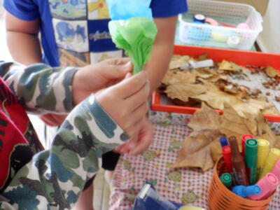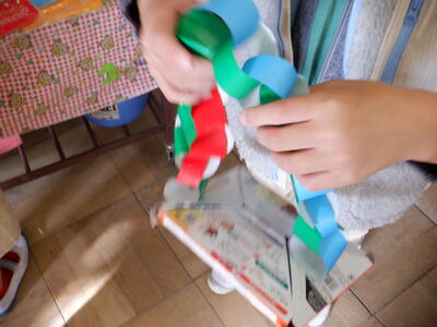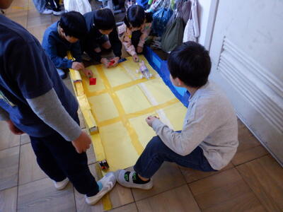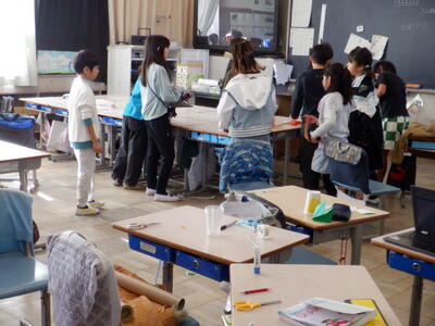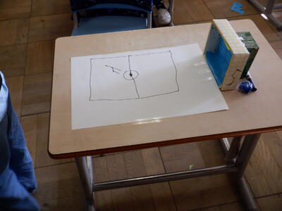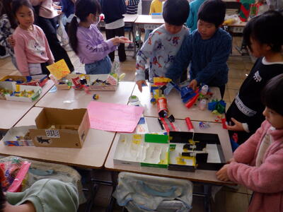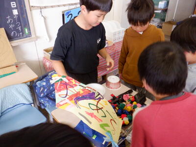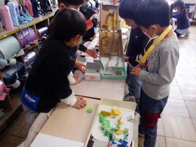 前回、2年生同士で、お試しで自分たちで作ったおもちゃで遊び、工夫・改良を重ねて本番に臨みました。
