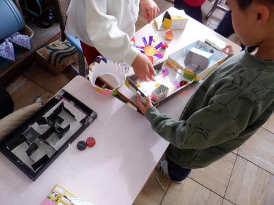 2年生の他のクラスでは、先日も紹介した1年生を招待してのおもちゃ遊びを行っていました。