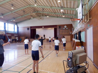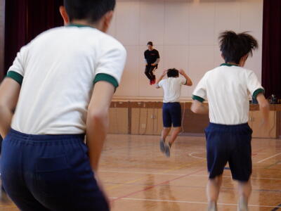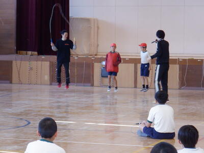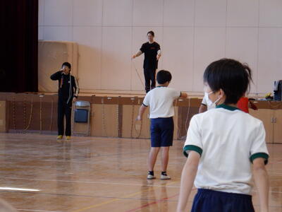 1年生も全員体育館で縄跳びをしていました。体育委員会の児童がお手本を示してくれていました。