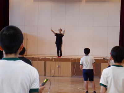 今年は、去年に引き続き、生山ヒジキさんをお呼びして、6年生にクラス毎に縄跳びを教えていただきました。