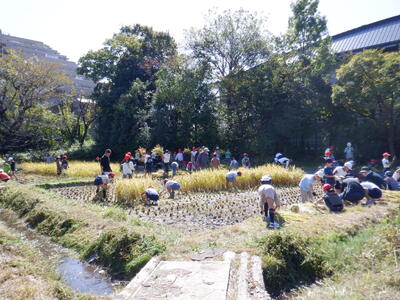 右の写真は下田家という古民家の移築復元の見学の様子です。水道もガスもない時代の家ですので、水は汲んで運んでくる、運ぶのが大変だから無駄なく使うようになっていること、かまどやいろりで火を起こし、火力で暖を取り調理したことを実物から学びました。