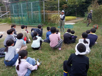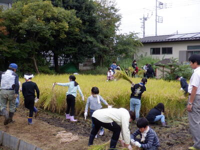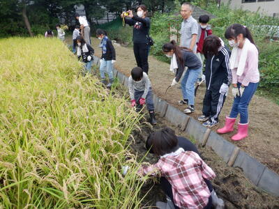 校庭西側にある、すずかけ広場の田んぼも稲がたわわに実り、今日は、稲刈りです。