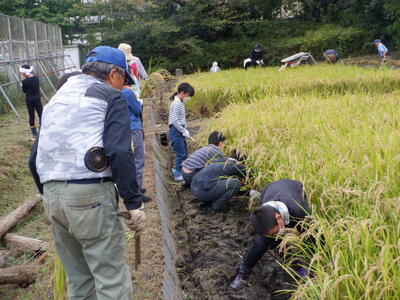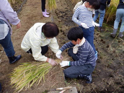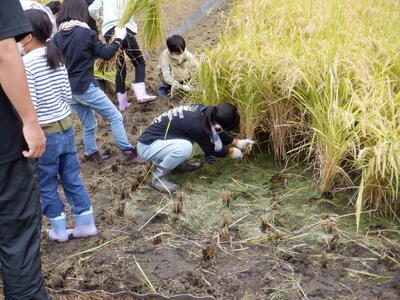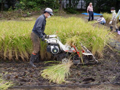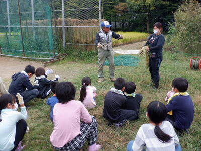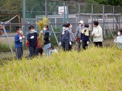 4年生の子供たちが田植えをしてから5か月、地域の方々のご協力で、今年も無事に収穫にたどりつきました。