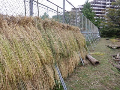 始めに稲刈りの説明です。①稲の刈り取り方、②刈り取った稲の束ね方、縛り方を教わります。