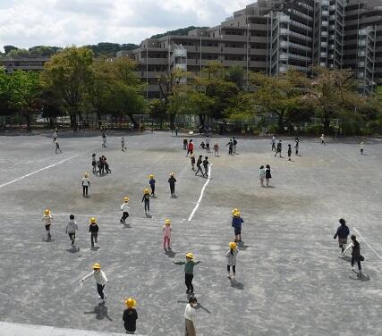 本日第1回の避難訓練で1年生は身を守ることを覚えます。