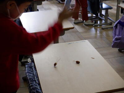 始めに、どんぐりの様子をよく見たり、色々などんぐりの種類を教えてもらったりした後、どんぐりゴマを作りました。あらかじめ、どんぐりクラブの方に開けていただいていたどんぐりの穴に、ようじを刺して、どんぐりゴマにします。完成したどんぐりごまを色々試して回してみた後、誰が一番長く回るか、競争しました。一番長く回っていた子にみんなの前で回してもらい、よく回るコツをみんなで考えました。