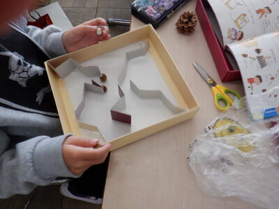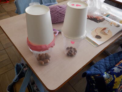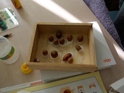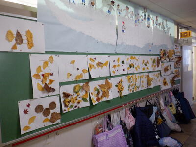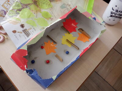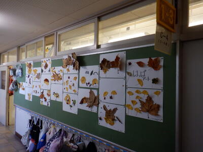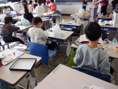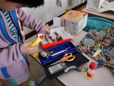 更に、1年生は、「あきのおもちゃづくり」ということで、どんぐりなど秋のものを使ったり、秋に関係させたおもちゃを作っていました。