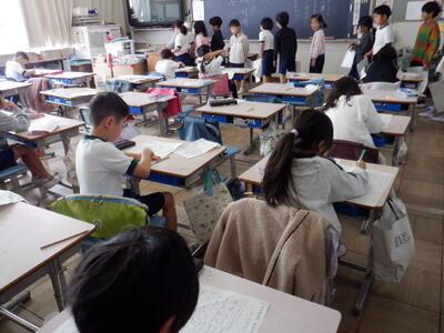 講師の加藤先生が、その伝統工芸品の実物をもっているということで、4年生の児童のためにもってきてくださり、触ったり、着たりなどの体験をさせてくださっているところです。
