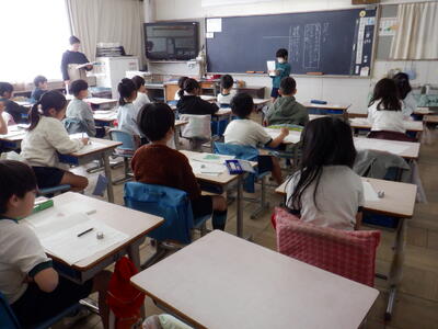 2年生の音楽では、リズムに合わせて、グループごとに前に出て、色々な楽器を順番に鳴らしたり、一緒に鳴らしたりしていました。