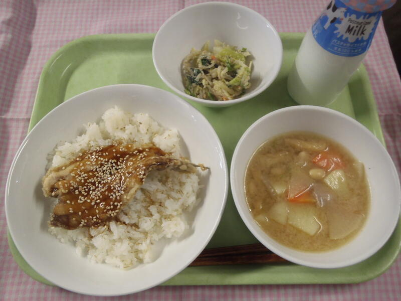 <献立>牛乳・いわしのかば焼き丼・野菜のアーモンド和え・鬼除け汁