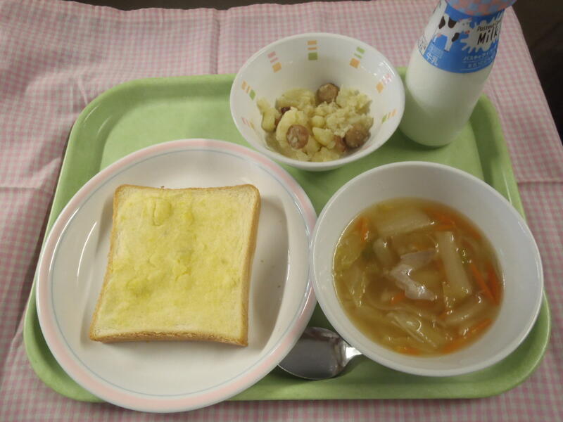 <献立>牛乳・おいもトースト・ウインナー入り粉ふきいも・白菜とはるさめのスープ