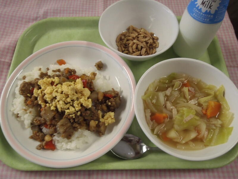 <献立>牛乳・トマトとれんこんの彩りガパオライス・きゃべつのスープ・シナモンアーモンド