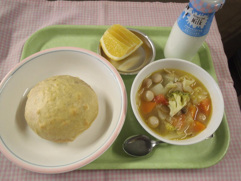 <献立>牛乳・アップルビスキュイパン・春野菜のポトフ・河内晩柑