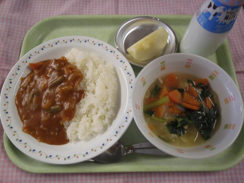 <献立>牛乳・ハッシュドポークライス・ABCスープ・りんご