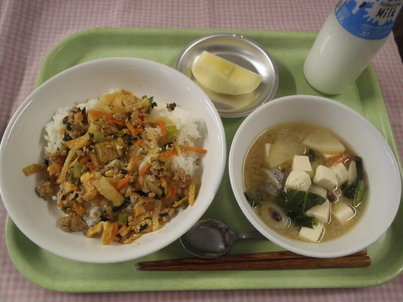 <献立>牛乳・和風ビビンバ・お事汁・りんご