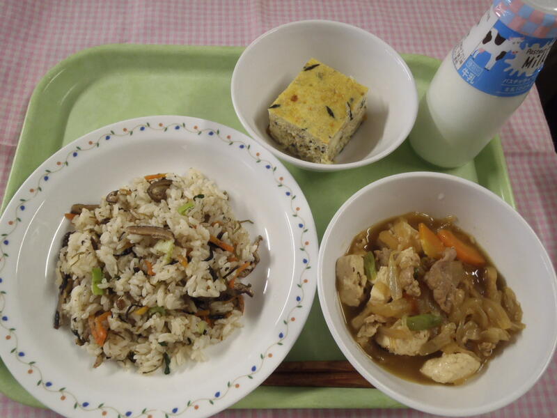 <献立>牛乳・昆布ごはん・五目卵焼き・肉豆腐