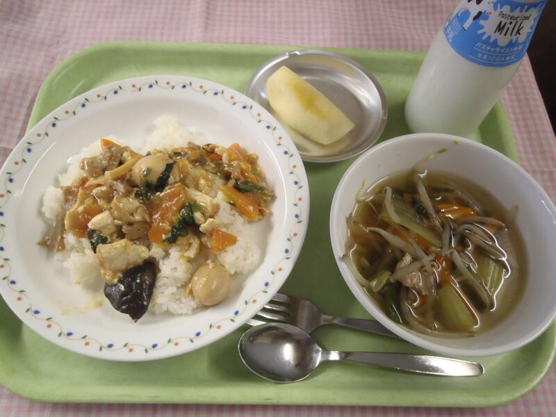 <献立>牛乳・厚揚げの五目味噌煮丼・チンゲン菜のスープ・りんご