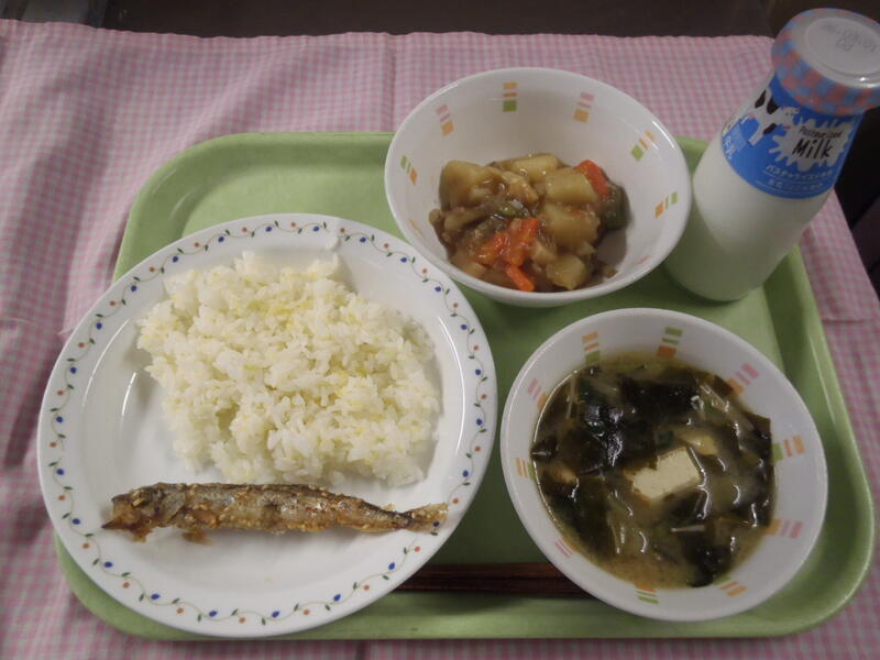 <献立>牛乳・きびごはん・じゃがいものそぼろ煮・ししゃものごま揚げ・みそ汁