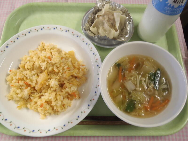 <献立>牛乳・キムタクごはん・えび入りしゅうまい・白菜のしょうがスープ