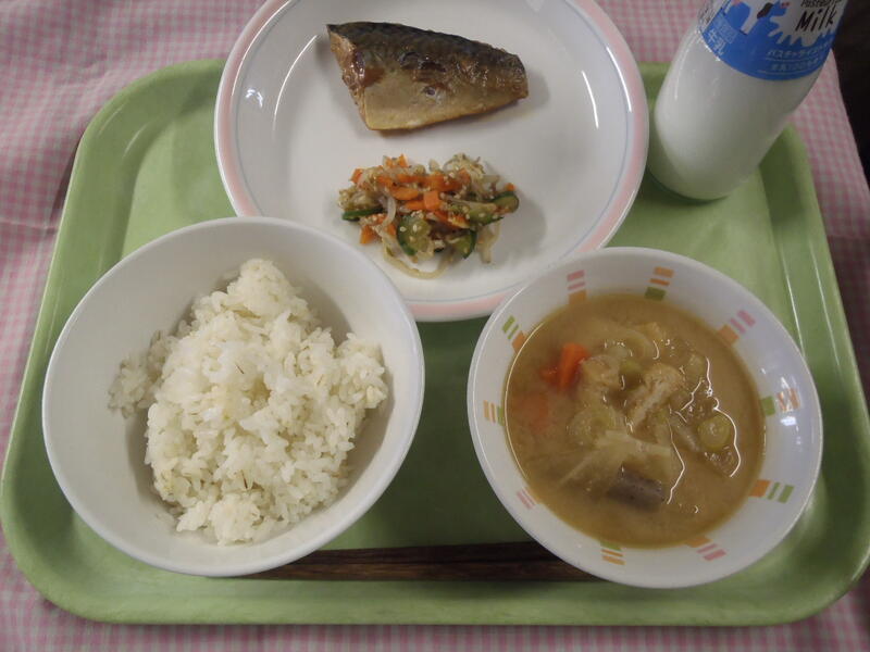 <献立>牛乳・麦ごはん・鯖の生姜煮・野菜のごま酢あえ・呉汁