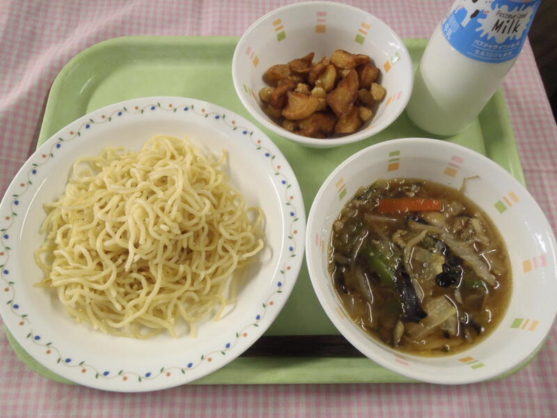 <献立>牛乳・八王子ラーメン(つけ麺)・芋と豆のペペロンチーノ