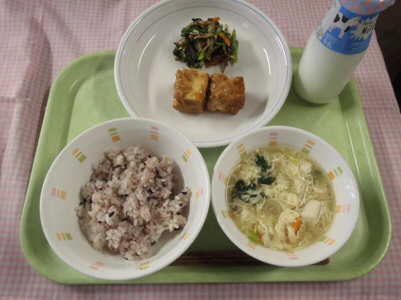 <献立>牛乳・古代米のお赤飯・厚揚げのごまだれかけ・野菜ののり和え・かきたま汁