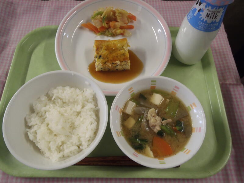 <献立>牛乳・ごはん・卵の千草焼き・白菜の変わり漬け・鶏汁