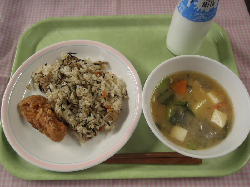 <献立>牛乳・ひじきごはん・いかの唐揚げ・豚汁