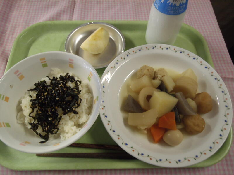 <献立>牛乳・ごはん・キムムッチ・おでん・りんご