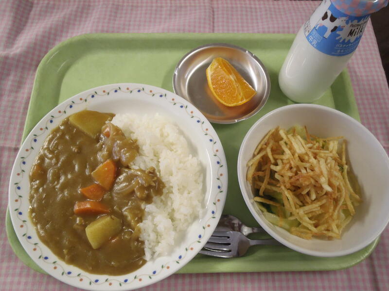 <献立>牛乳・カレーライス・カリカリポテトサラダ・しらぬい