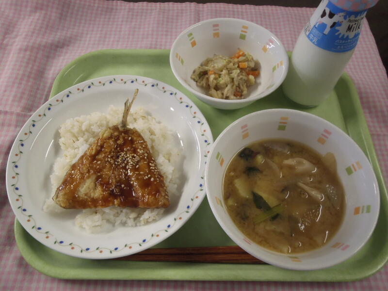 <献立>牛乳・魚の蒲焼丼・野菜のアーモンド和え・野菜のみそ汁