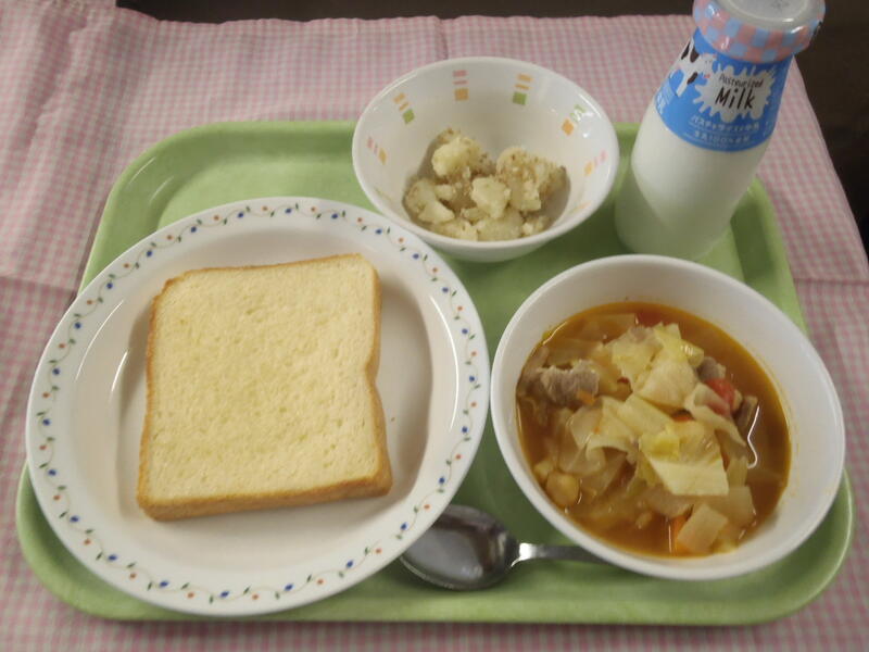 <献立>牛乳・レモンバタートースト・ごまポテト・ミネストローネ