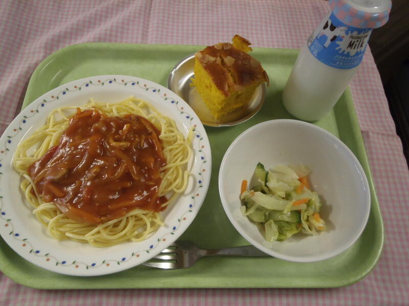 <献立>牛乳・スパゲッティアラビアータ・フレンチサラダ・パンプキンケーキ