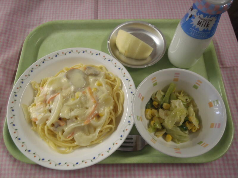 <献立>牛乳・クリームスパゲッティ・バジルサラダ・りんご
