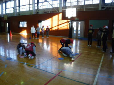 アクティブタイム(1.16) 投稿日時 : 2024/01/16 webadmin カテゴリ:4年生 今朝はアクティブタイムでした。 4年生は体育館で寒さを吹き飛ばすように 元気に体を動かして楽しく活動していました。 赤白チームに分かれてパッドの色をひっくり返して残った枚数を競います。 こちらは途中つかまらずに反対側まで行けるどうか、 すぐつかまってしまう人、 うまくすり抜けるタイミングを 狙って走りぬける人もいました。 寒い中でしたが、体をアクティブに動かししっかり温まったようでした。 {{options.likeCount}} {{options.likeCount}}