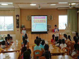 今日は、元気に一日を過ごすための生活のリズムについて、ヤクルトから講師の方をお招きし、「おなか元気教室」を実施しました。「早寝・早起き・朝ごはん・朝うんち」の大切さを、映像を見ながら解説をしていただきました。