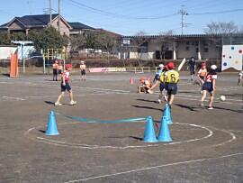 次は何をするのか、一つ一つ担任の佐野先生の声に合わせて子供たちが同じように声に出して確認し合っている姿や、実際に先生がやり方を子供たちの前で示した後に一連の掛け声の流れで子供たちが運動する場面など、低学年の授業らしい丁寧な進め方が見られました。また、子供たちが2人組になって、ボールを使った動きを考える活動では、互いに意見を出し合って工夫した動きを試して、1年生ながらいろいろなアイデアが出ており、感心しました。とても寒い中での運動でしたが、子供たちは1時間の流れを理解し、授業のねらいを意識して楽しそうに動いていました。
